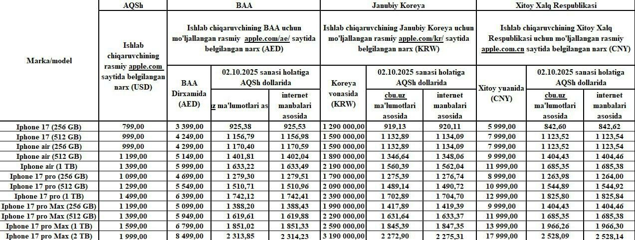 Так, при ввозе IPhone 17, которое сегодня представляет наибольший интерес для узбекистанцев, если на официальном сайте компании Apple не указана цена, то будет необходимо наличие документов на товар.