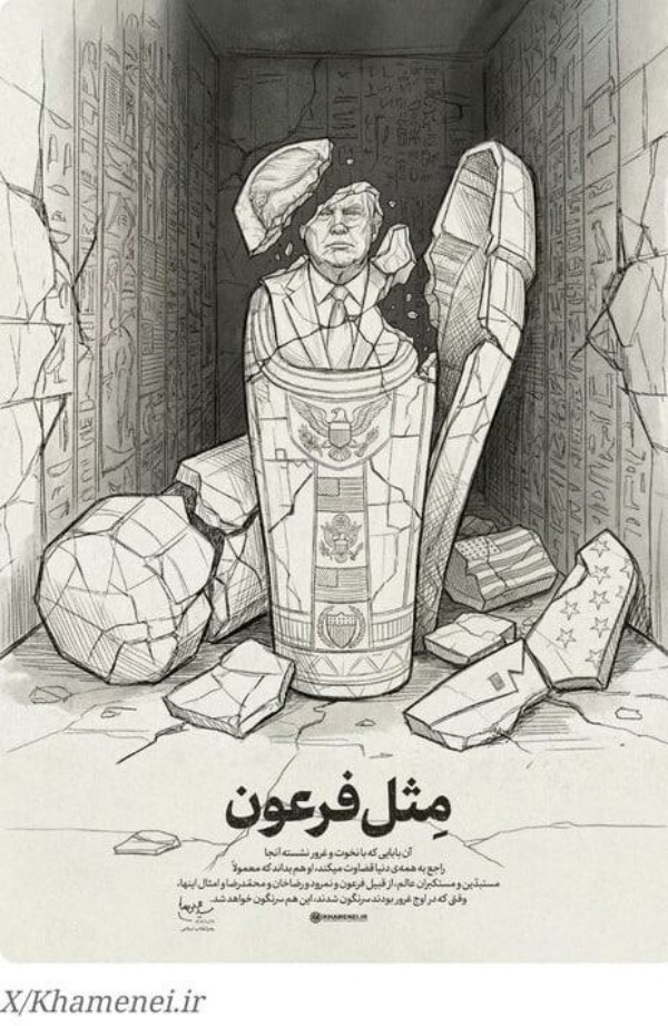 Аятолла Хаменеи, реагируя на предупреждения Дональда Трампа, опубликовал карикатуру, где президент США изображён в виде саркофага, подписав пост словами: «И он будет устранён».