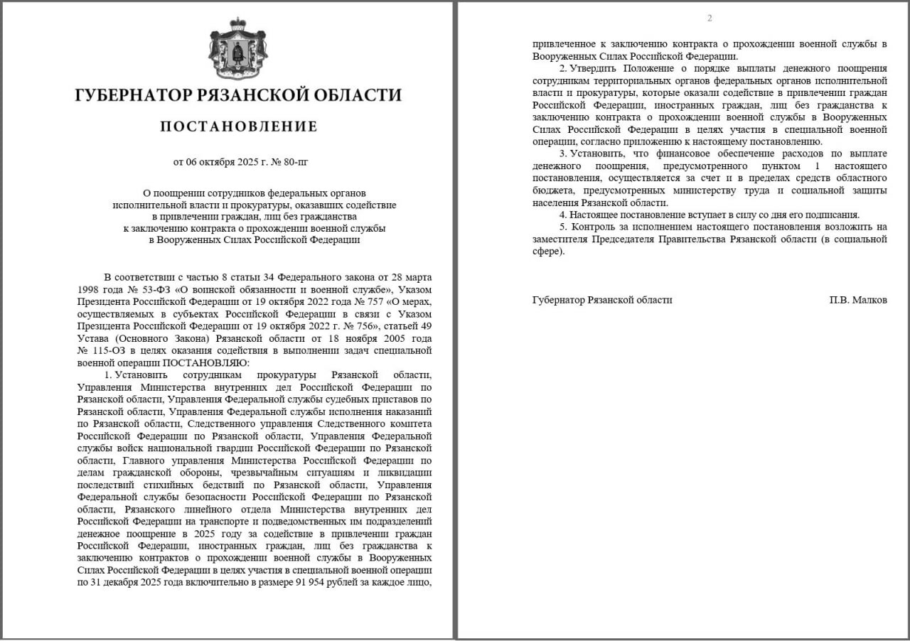 Согласно постановлению главы области, сотрудники прокуратуры, МВД, ФСИН, ФССП, СК, МЧС, ФСБ и Росгвардии за каждого привлечённого контрактника будут получать выплату до конца 2025 года. Отмечается, что мера направлена на выполнение планов по набору на военную службу.