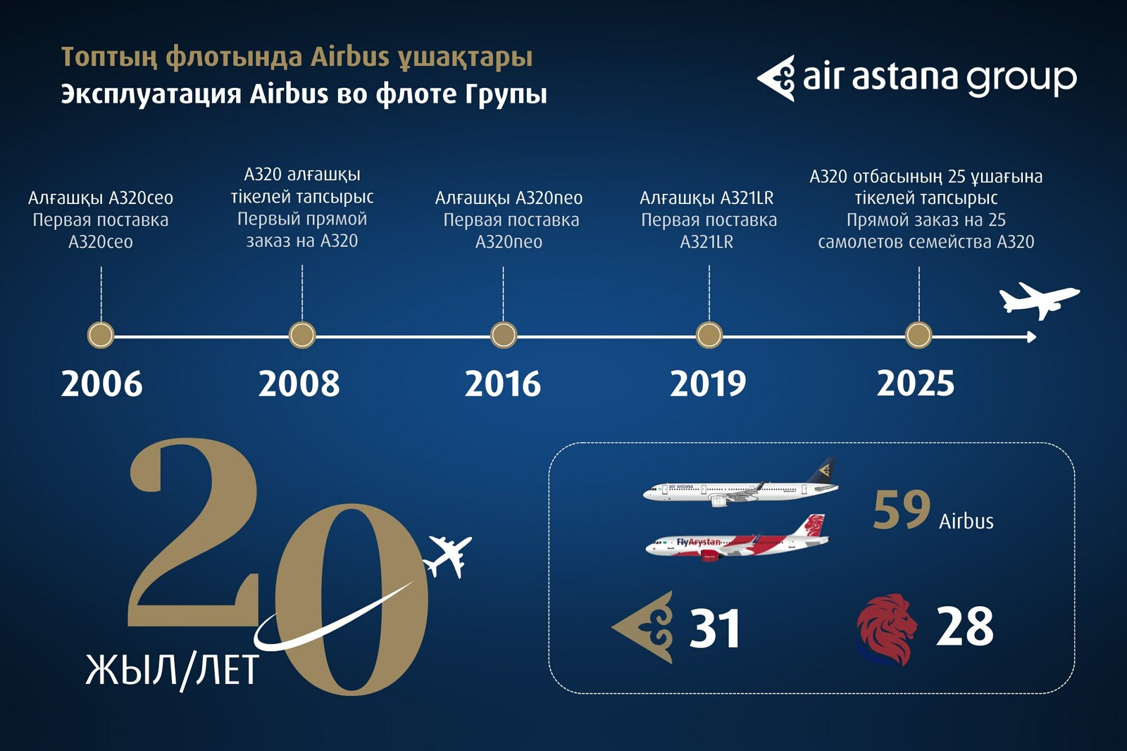 Первый прямой контракт с европейским производителем Air Astana заключила в 2008 году. Машины по этому соглашению начали поступать в 2012–2013 годах. Для казахстанской авиации это стало историческим событием — впервые после получения независимости местный авиаперевозчик напрямую заказал воздушные суда у Airbus.