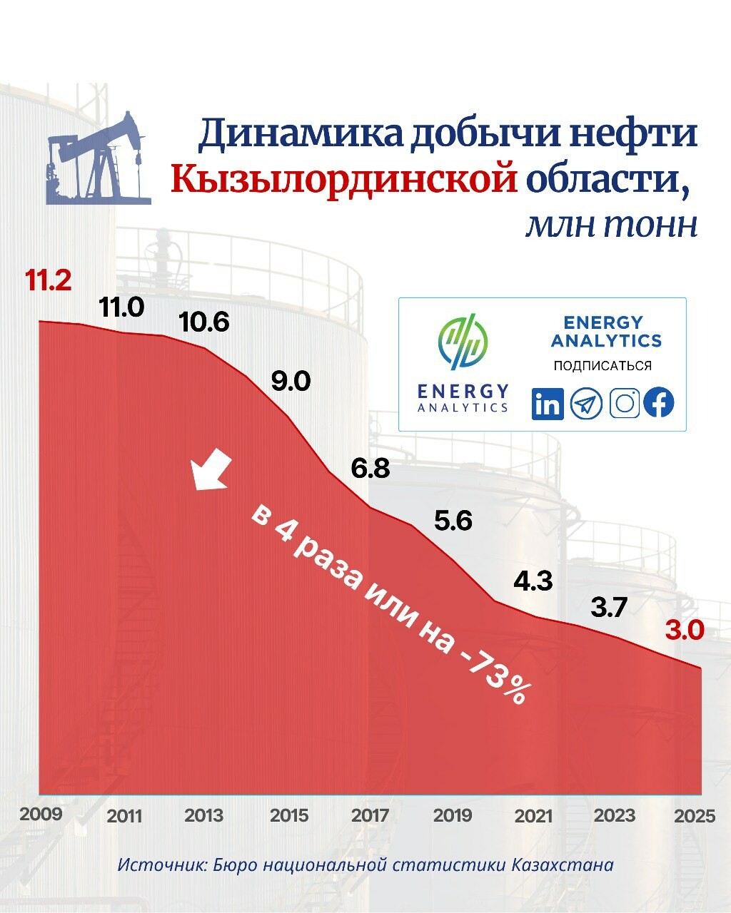 Кызылординская область потеряла 73% объемов нефтедобычи за последние 15 лет, регион эксплуатирует зрелые месторождения без новых открытий, передает ArbatMedia.
