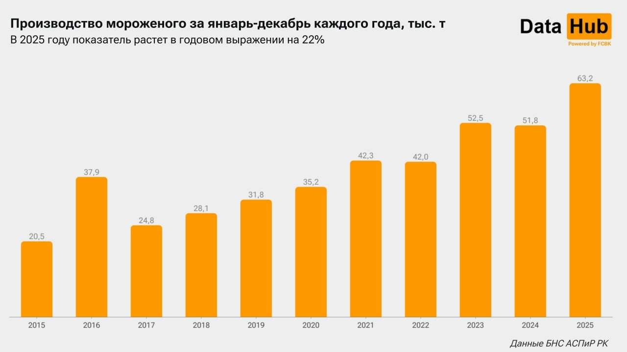 Как сообщает Telegram-канал DataHub, отечественные производители смогли не только увеличить выпуск, но и значительно нарастить экспорт. За 11 месяцев 2025 года за рубеж было отправлено 13,6 тысячи тонн мороженого — это на 39% больше по сравнению с предыдущим рекордом. Основные направления поставок — Россия, Кыргызстан и Узбекистан.
