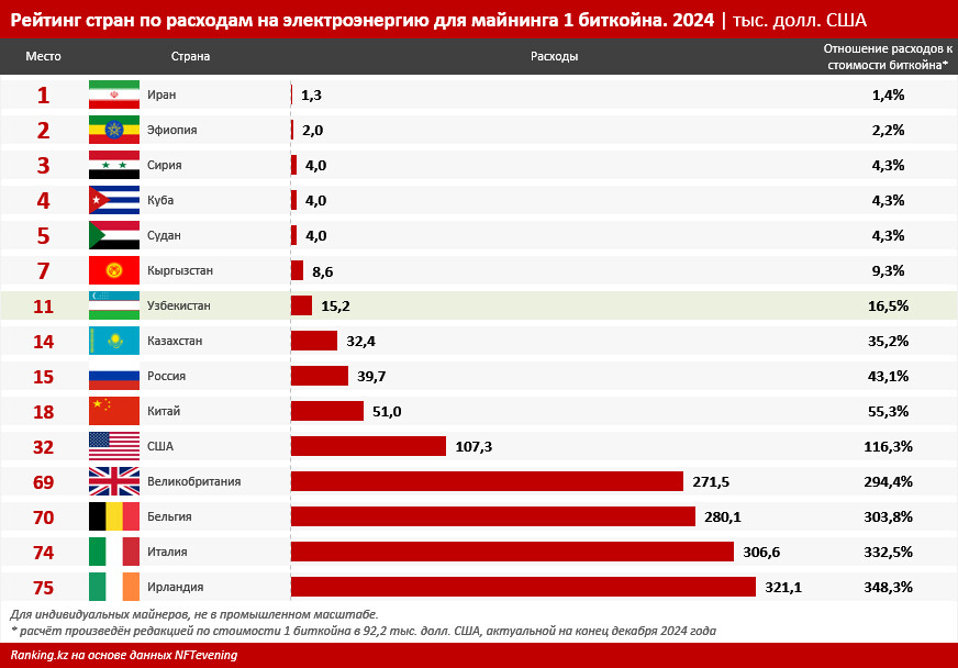 По информации аналитиков Ranking, Казахстан занял 14 место из 75 стран, где ведётся майнинг и доступна информация по стоимости электроэнергии. В 2024 году затраты на добычу одного биткоина в стране составляли около $32 тыс. (15 млн тенге). При цене $92 тыс. (около 49,5 млн тенге) за биткоин это делает майнинг рентабельным.