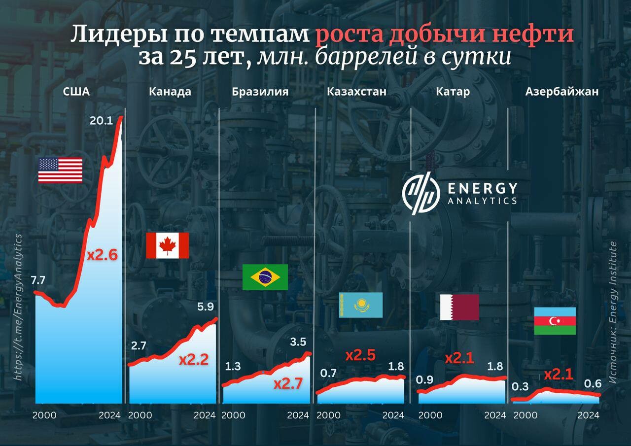 Азербайджан — рост в 2,1 раза (с 0,3 до 0,6 млн барр./сутки). АЧГ и другие каспийские проекты обеспечили стабильный рост.