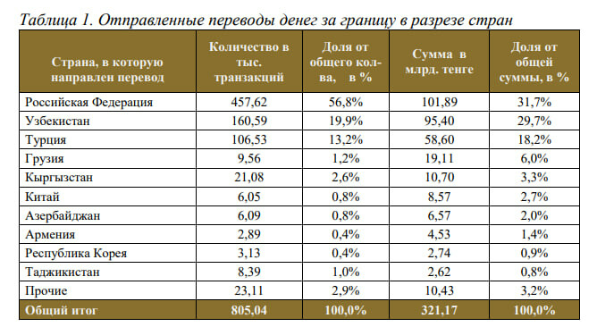 Основные направления переводов из Казахстана: Россия (31,7%), Узбекистан (29,7%), Турция (18,2%), Грузия (6,0%) и Кыргызстан (3,3%). При этом наиболее заметное снижение зафиксировано по Турции (–27%), России (–15%) и Грузии (–35,5%).