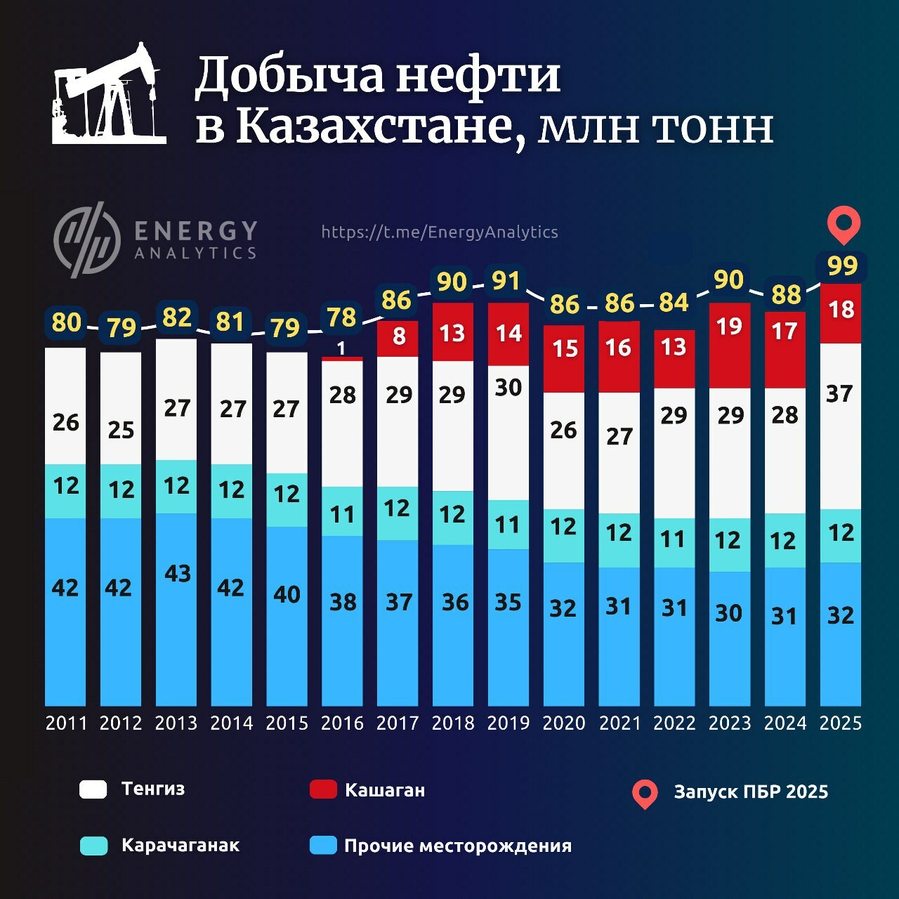 Проект будущего расширения на Тенгизе оправдал ожидания: в 2025 году месторождение достигло отметки в 37 млн тонн. Именно этот рывок помог республике впервые приблизиться к показателю в 100 млн тонн совокупной добычи нефти.